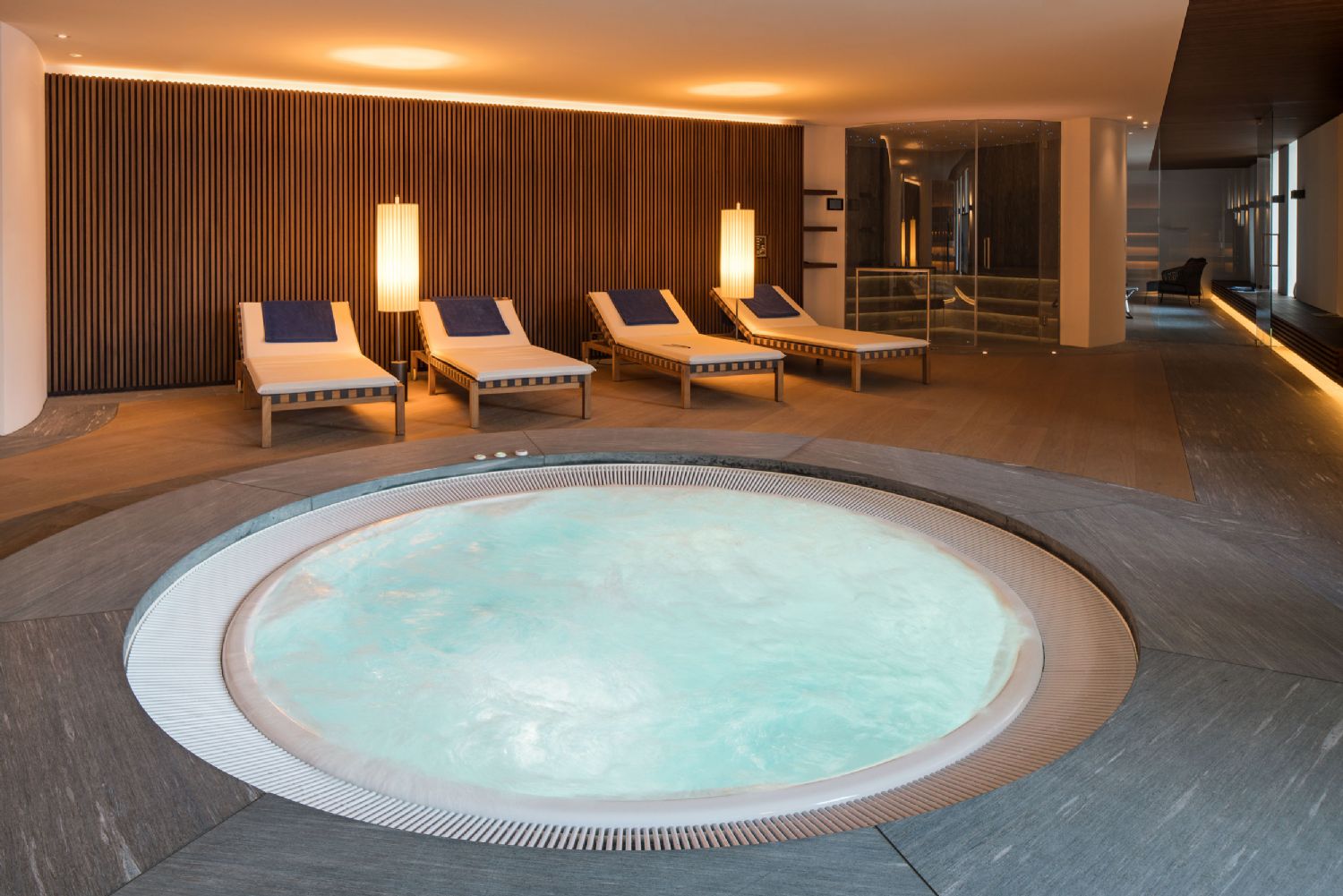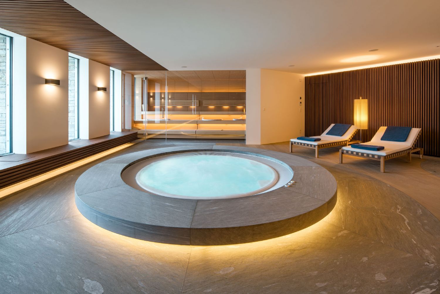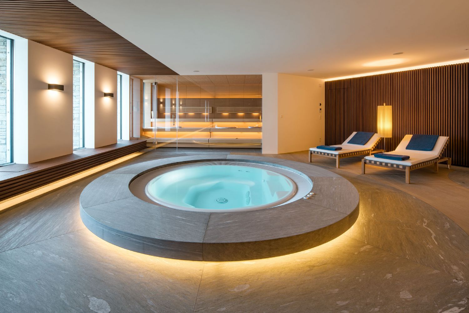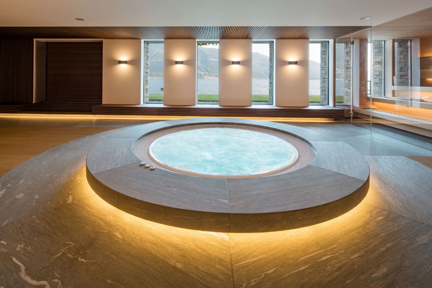 "Der zentral im Raum platzierte Whirlpool mit Ausblick auf Garten und See zieht alle Blicke auf sich. Und das zu Recht. Denn das im Durchmesser 2.55 m grosse Sprudelbecken aus Sanitär-Acryl ist mit Überlaufrinne, vier Massageplätzen und LED-RGB-Unterwasserscheinwerfern ausgestattet sowie mit einem breiten Rand aus dunkelgrauem Granit aus dem nahegelegenen Onseronene-Tal verkleidet. Der am Sockel angebrachte LED-Lichtkranz vermittelt dem Pool den Look eines Ufos, das die Erholungssuchenden aus dem hektischen Alltag entführt."