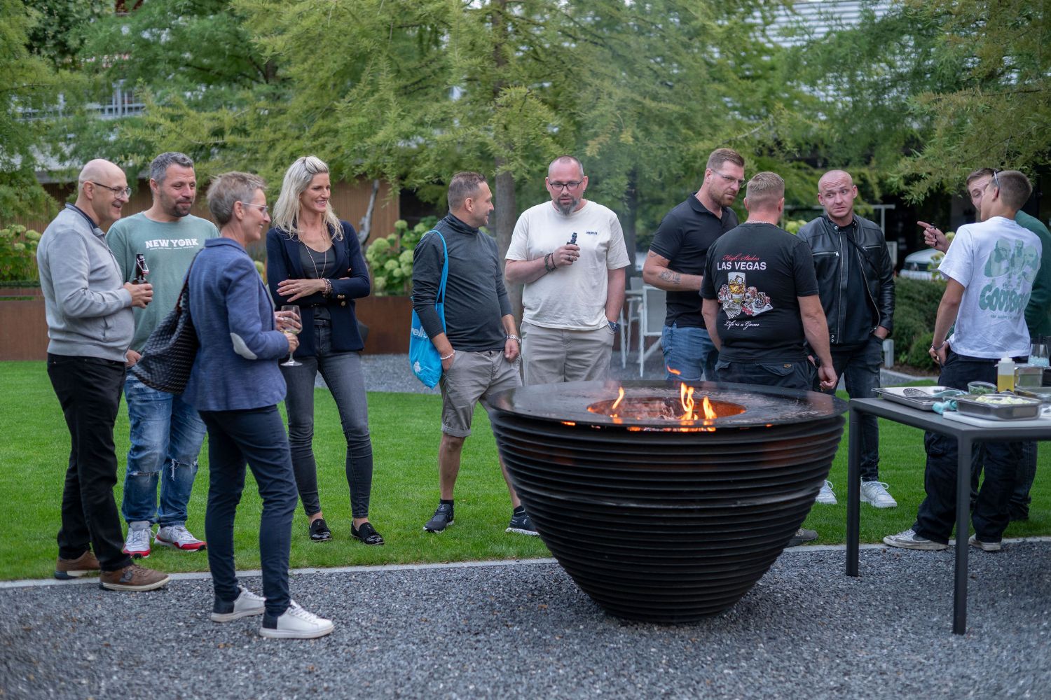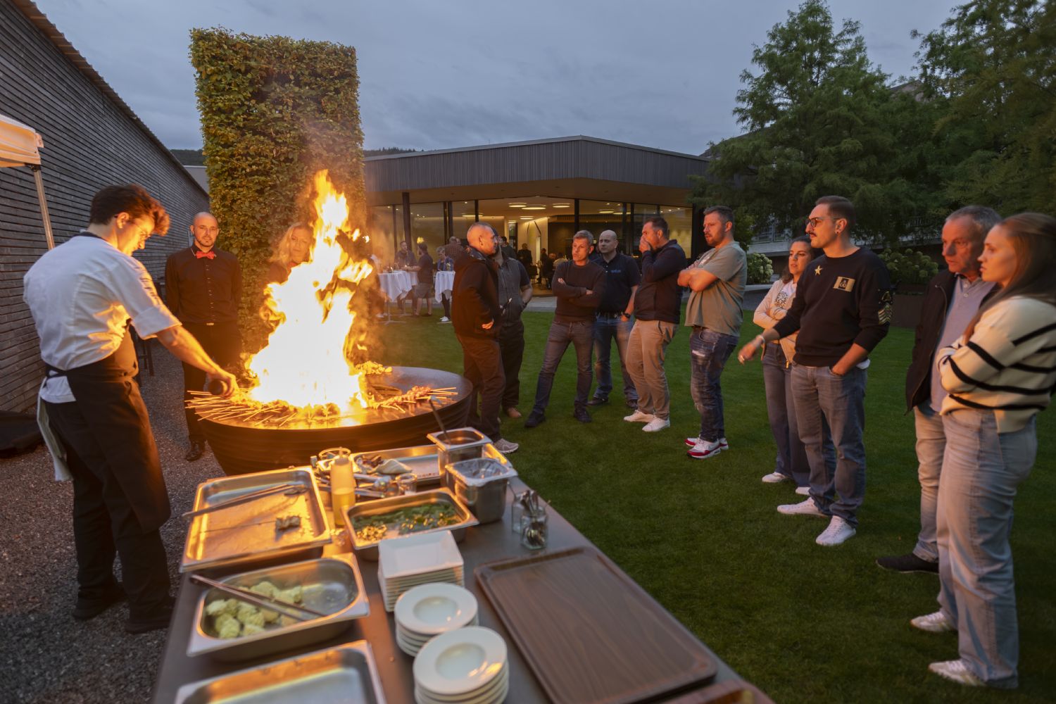 Der Abend begann mit einem gemütlichen Apéro, bevor uns das Team von Plus+ Catering aus Egerkingen den ganzen Abend über kulinarisch verwöhnte. Ein besonderes Highlight war das Grillen am Feuerring, bei dem feine Spezialitäten zubereitet wurden.