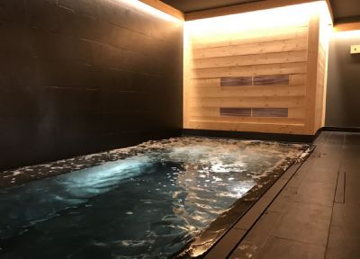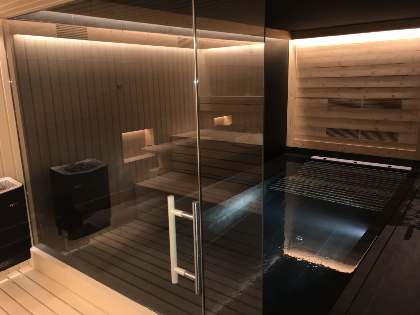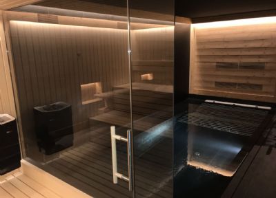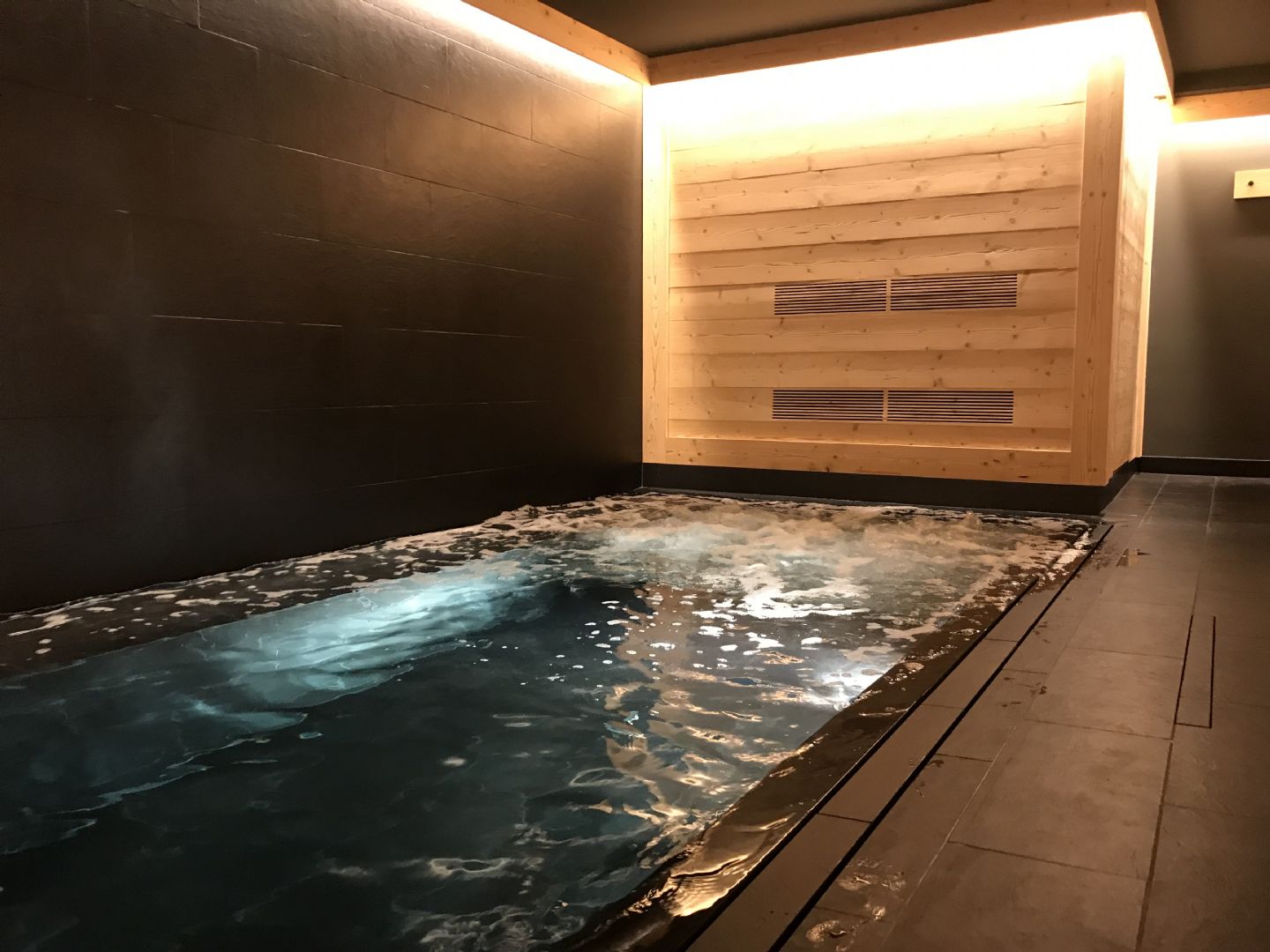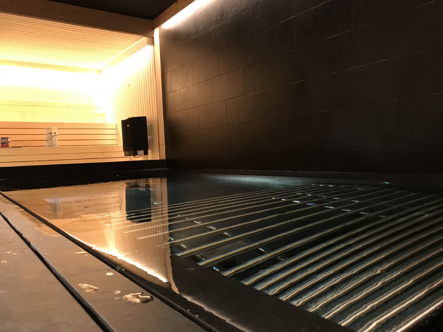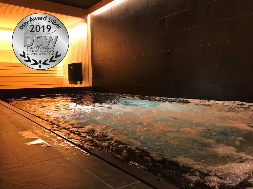 "Construit de manière élaboré et résolu de manière magistrale sur le plan technique. Le tourbillon est placé directement à côté du sauna et peut être vu de là avec son éclairage sous-marin comme un "festin pour les yeux". Les couleurs sombres de l'environnement dirigent l'oil directement vers la surface de l'eau en mouvement. Un spacieux bain à remous, intégré avec goût dans la pièce".